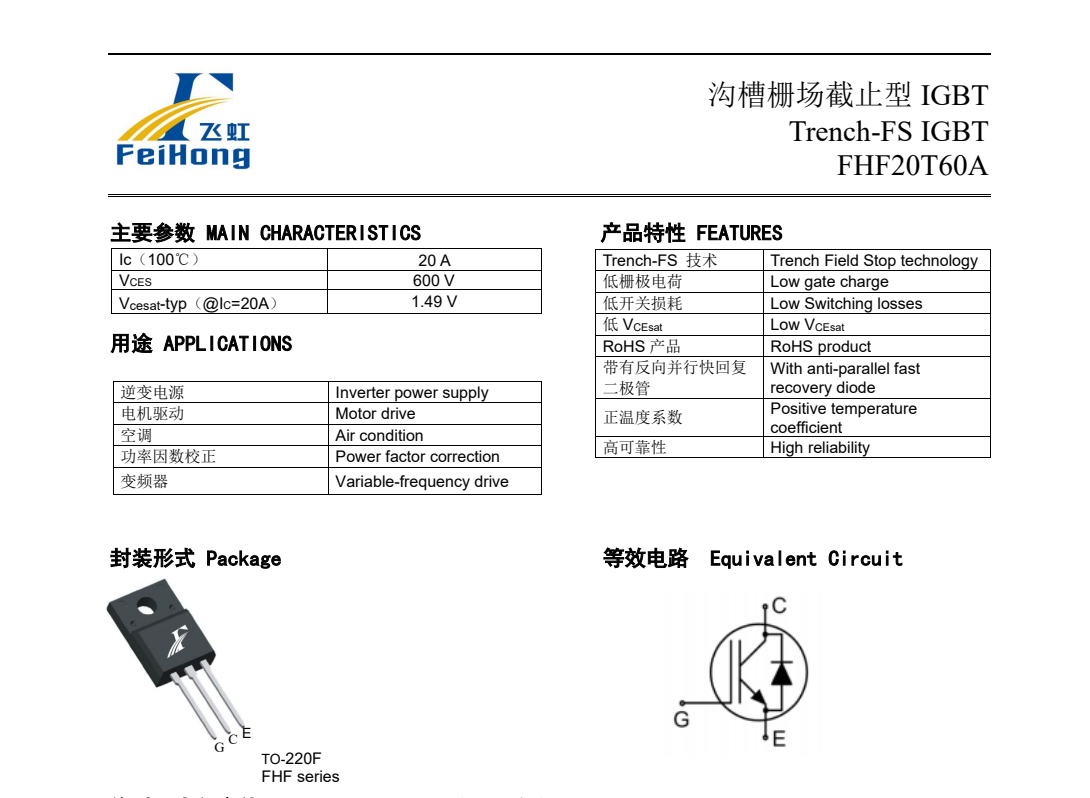 采用SGT工藝來獲得極低的RDSON導通內阻,飛虹產品具有寬泛的BV電壓,快速的開關能力和優異的抗短路性能,TO-220產品廣泛應用于各類DC/DC電源,DC-AC逆變器,AC-DC開關電源,儲能電源,園林工具和BLDC電機驅動等。TO-263產品廣泛使用在各類鋰電池保護板上。可替代場效管:SVG095R0NT、 IPP052N08N5