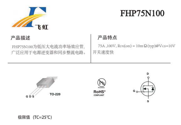 FHP75N100的主要封裝形式是TO-220,腳位排列位GDS。這款75N100場效應管產品具體參數:Vgs(±V):25;VTH(V):2-4;ID(A):75;BVdss(V):100。RDS (on) = 10mΩ(typ)@V GS =10V,開關速度快。
